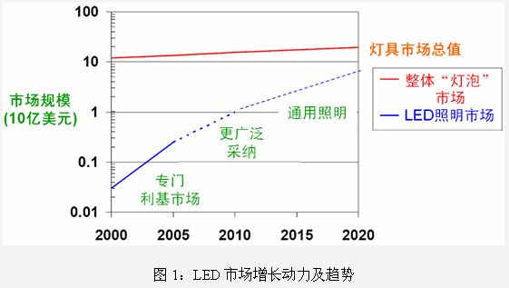 LED以其壽命更長、優異的色彩組合、節能及符合環保要求,已成為照明革命的關鍵動力。近年來,LED成為了增長速度最快的半導體市場之一,5年年復合增長率達到19.3%,預計2013年市場總值可達124億美元,見圖1。