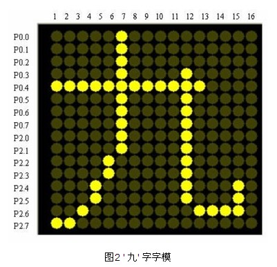 本設計的點陣顯示屏電路是以AT89S52 單片機作主控器,結合74LS154 和74LS595 進行擴展。選擇了共陰的行列掃描方式,單片機P0,P2 口輸出的高電平對應字模的亮點,低電平對應字模的暗點,以九字為例,如圖2 所示。