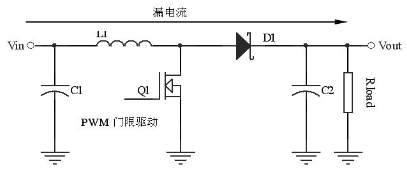 (1)電池使用壽命短:圖2 中,即使關(guān)斷升壓轉(zhuǎn)換器主開(kāi)關(guān),Vin 與Vout 之間仍會(huì)形成一條電流泄露路徑,如果在輸出端接有任何負(fù)載,其中泄露電流Ileak 接近于Vin/Rload,那么漏電流的存在使的蓄電池一直處于工作狀態(tài),這樣將會(huì)縮短電池的使用壽命。
