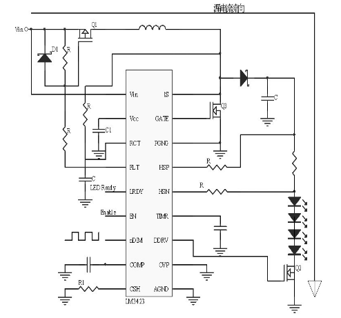 美國(guó)國(guó)家半導(dǎo)體研發(fā)的LM3423 芯片輸入電壓范圍在4.5V 到75V之間,適用于極寬的輸入電壓范圍;50KHZ 的快速PWM調(diào)光;內(nèi)部基準(zhǔn)電壓50mV- 1.25V;工作頻率最大可達(dá)到1MHZ;內(nèi)部驅(qū)動(dòng)能力750mA,超低電流停機(jī)小于2uA.可以用來(lái)配置升壓、浮動(dòng)降壓、浮動(dòng)降壓/ 升壓和SEPIC 拓?fù)浣Y(jié)構(gòu)中低側(cè)外部MOSFET的控制器;使用峰值電流模式控制器和預(yù)測(cè)性關(guān)閉時(shí)間設(shè)計(jì)來(lái)調(diào)節(jié)LED 電流,峰值電流模式控制器與預(yù)測(cè)性關(guān)閉時(shí)間設(shè)計(jì)的組合簡(jiǎn)化了回路補(bǔ)償設(shè)計(jì),同時(shí)提供內(nèi)在的輸入電壓前饋補(bǔ)償;設(shè)有用于控制外部調(diào)光FET 和系統(tǒng)"零電流"關(guān)閉特點(diǎn)的集成驅(qū)動(dòng)器;并且具有LED 狀態(tài)輸出標(biāo)記、故障標(biāo)記、可編程故障計(jì)時(shí)器和邏輯針腳,用于控制調(diào)光驅(qū)動(dòng)器的極性。