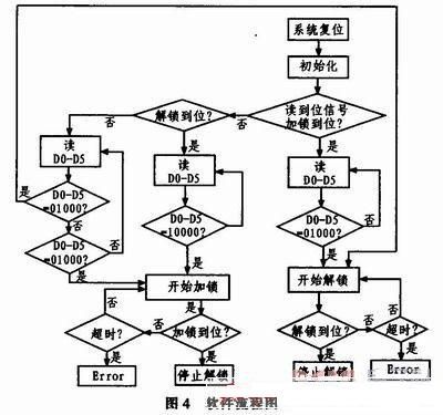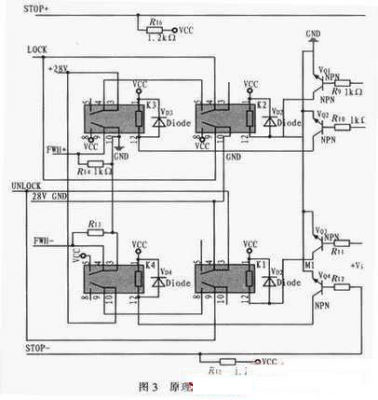 當(dāng)信號(hào)D0-D5為10000時(shí),單片機(jī)通過P10口對(duì)方位鎖定機(jī)構(gòu)發(fā)出加鎖命令,控制命令經(jīng)SN54LS245驅(qū)動(dòng)后作用于R9和VQ1,VQ1導(dǎo)通后,繼電器K2的4、5導(dǎo)通,輸出+28 VLOCK信號(hào)控制電機(jī)進(jìn)行加鎖。完全鎖定后,光電開關(guān)輸出(上)信號(hào)輸出高電平即圖3中STOP+,STOP+通過上拉電阻R16作用于R10和VQ2,VQ2導(dǎo)通后,繼電器K3的4、5和8、9導(dǎo)通,+28 V LOCK信號(hào)切斷,硬件上先停止加鎖控制,防止造成機(jī)構(gòu)硬件損傷。而K3的8、9導(dǎo)通后,F(xiàn)WH+輸出+5 V電平給單片機(jī),單片機(jī)接收信號(hào)后,終止加鎖命令,VQ1截止,K3恢復(fù)常態(tài)。解鎖過程和加鎖過程類似,在此不作贅述。
