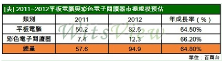 整體而言, WitsView 認(rèn)為 2012年平板電腦的發(fā)展基調(diào)將偏向樂觀,預(yù)估平板電腦本身的需求達(dá)8,260萬臺(tái),彩色電子閱讀器方面則為1,230萬臺(tái),兩者合計(jì)的市場(chǎng)規(guī)模將從今年的5,760萬臺(tái)攀升至9,490萬臺(tái),年成長(zhǎng)率高達(dá)65%。