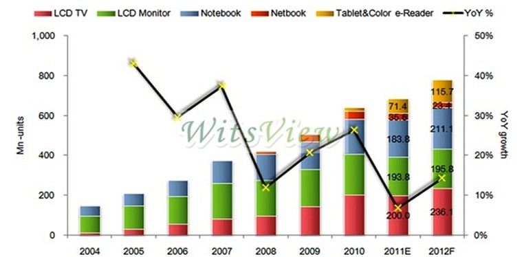 在low cost direct type LED TV、 3D TV 、super narrow bezel、 LED Monitor 、ultra slim module、high resolutiON、new TV sizes、high transmittance panel、 Windows 8 等新產品及新作業系統的帶動下,WitsView對于2012年大尺寸面板的需求抱持著審慎而樂觀的看法,預估年成長率將達12~14%,面板總量上看7億8,000萬片,其中平板電腦及彩色閱讀器面板的年成長率仍將超過60%,達1億1,500萬片。