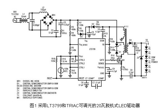 創(chuàng)造更精小并具成本效益解決方案LT3799運用具整個LED驅動電路(包括電磁干擾濾波器)的單級設計,僅需要四十個外部組件,讓解決方案簡單、配置面積精小和具成本效益等優(yōu)勢。圖1中20瓦電路的總尺寸僅為30毫米(mm)×75毫米,厚度僅為30毫米,非常適用于多種LED應用。透過改變幾個外部組件,這個電路就可以進一步為120VAC、240VAC甚至377VAC應用或幾乎任何常見的AC輸入而優(yōu)化。