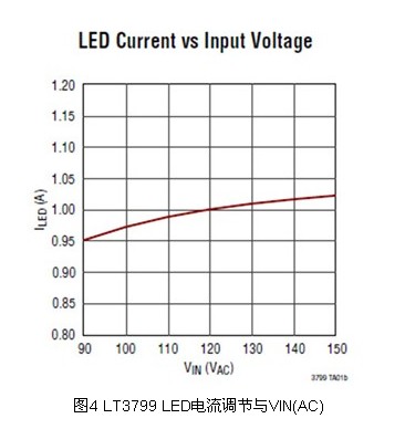 此外,LT3799在整個輸入電壓、輸出電壓和溫度范圍內提供LED電流調節(jié)。從圖4可見,正如大多數(shù)美國照明應用所要求,當輸入從90VAC變到150VAC時,LED電流保持在±5%的調節(jié)范圍內。LT3799采用一個獨特的電流檢測電路取代了光耦合器,以向二次側提供良好調節(jié)的電流。此舉不僅降低了成本,還改善了可靠性。