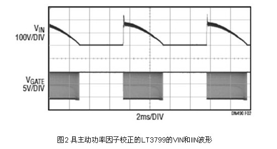 透過使線路電流跟隨施加的正弦波電壓,這種高功能整合的驅動電路實現(xiàn)了高功率因子,并且滿足了IEC 61000-3-2 C類照明設備諧波要求。如果所吸取的電流與輸入電壓成正比,就能實現(xiàn)等于1的功率因子。其用一個從輸入電壓產生并與輸入電壓成比例的電壓調制峰值開關電流。如圖2所示,這種方法提供0.98或更高的功率因子。一個小帶寬回饋環(huán)路保持對輸出電流的調節(jié),而且不會使輸入電流失真。