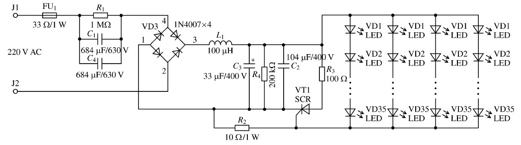 該電路共驅動140只白光LED (小功率) ,采用35串4并的模式,采用電容降壓式驅動方式。其中, C1、C4 為并聯的兩個相同的電容,起降壓及限流作用; 4個1N4007組成的整流橋對輸入交流電壓進行整流;濾波電容C3 用于濾除整流輸出電壓中的交流成分,使電壓更為平滑; L1、C2 用于濾除輸出電壓中的高頻成分;電阻R4 為C3 提供放電回路;采用單向晶閘管SCR729210對電路進行保護, R3 為限流電阻。