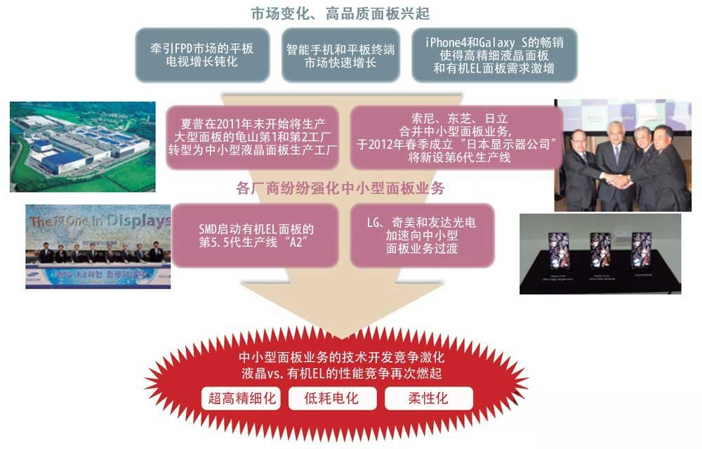 日韓臺的面板廠商開始將業務重心從電視機用大型面板轉向智能手機和平板終端使用的中小型面板。今后,技術開發競爭將越來越激烈。