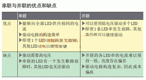 串聯的優點是同串的LED亮度均一。因為向所有LED供應的電流相同。而且,驅動用IC只需輸出一個電流,就能夠點亮串聯的全部LED,電路的結構簡單。除此之外,即使一個LED短路發生短路故障,其他LED仍能繼續點亮也是其優點所在。