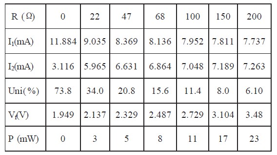 計算機(jī)利用對分法算出了在總電流為15mA,外加偏置電阻(R)為R4=R5=0 , 22 , 47 , 68 , 100 , 150, 200 (Ω) 時, D1 和D2 的電流( I1 和I2) 、亮度均勻性( Uni)、正向電壓(V5) 、以及偏置電阻帶來的功耗(P)。