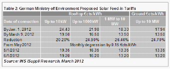 對于2012和2013年,德國政府確認(rèn)的年度安裝目標(biāo)是2.5-3.5GW,從2014年開始,該目標(biāo)將每年下調(diào)400MW。表2所示為德國環(huán)境部所建議的FIT體系。