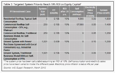 在FIT調(diào)整之后,IHS iSuppli公司的計算結(jié)果顯示,如果系統(tǒng)價格為1850歐元/kW,即使取消自我消費獎勵,德國住宅系統(tǒng)仍能達(dá)到10%的股本(20%)投資回報率。由于德國市場的價格已經(jīng)降到這樣的水平,住宅領(lǐng)域?qū)⒗^續(xù)提供有吸引力的投資條件,盡管政府降低FIT。