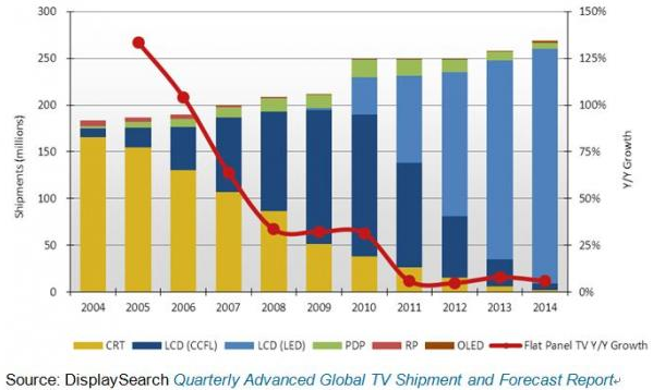 根據NPD DisplaySearch季度全球電視出貨和預測報告Quarterly Advanced Global TV Shipment and Forecast Report指出,全球電視出貨量連續兩年持平,2012年出口到西歐、日本等發達市場的電視總量預計將較去年下降11%,由此抵消了新興市場8%的年成長。盡管如此,隨著CRT和等離子電視逐步淡出市場,液晶電視將持續獲得更大市場份額。