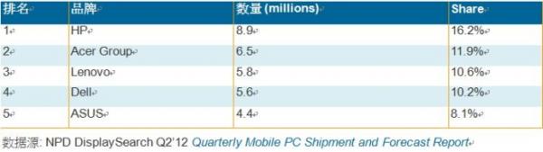 Q1 12全球前五大Mobile PC品牌出貨排名初步調查結果