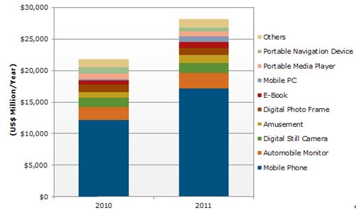 - 應用于手機的主動矩陣式顯示器的出貨量增加到2011年的15億臺