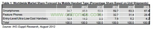 今年智能手機(jī)出貨與與市場(chǎng)份額強(qiáng)勁擴(kuò)張,將首次成為領(lǐng)先的手機(jī)類(lèi)型,而且未來(lái)幾年出貨量將保持兩位數(shù)的增長(zhǎng)速度。到2016年,智能手機(jī)將占總體手機(jī)市場(chǎng)的67.4%,如表1所示。