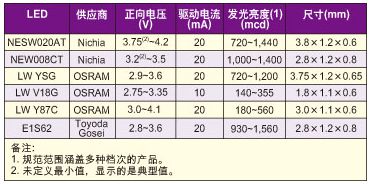 LED技術(shù)持續(xù)快速改進(jìn),制造商在使用新的材料、制造技術(shù)和LED設(shè)計(jì)來為同等大小的電流釋出更大的光輸出,這樣一來,幾年前需要4個(gè)LED進(jìn)行背光的顯示屏如今可能采用2個(gè)LED就能實(shí)現(xiàn)同樣的背光亮度。不僅如此,過去通常使用冷陰極熒光燈(CCFL)進(jìn)行背光的4到7英寸較大顯示屏,如今正在轉(zhuǎn)向使用LED進(jìn)行背光。此外,LED的正向電壓正趨向更低。因此,不僅需要考慮驅(qū)動(dòng)器制造商的數(shù)據(jù)表曲線上的驅(qū)動(dòng)器效率,還需要基于采用所選LED對(duì)驅(qū)動(dòng)器進(jìn)行的評(píng)估來予以考慮。表1列舉了幾款LED的一些重要規(guī)范,顯示了這些LED在正向電壓和發(fā)光亮度等方面的差別。需要說明的是,正向電壓范圍的變化較大,這意味著驅(qū)動(dòng)器的效率應(yīng)該采用LED規(guī)范的極限值來進(jìn)行評(píng)估。