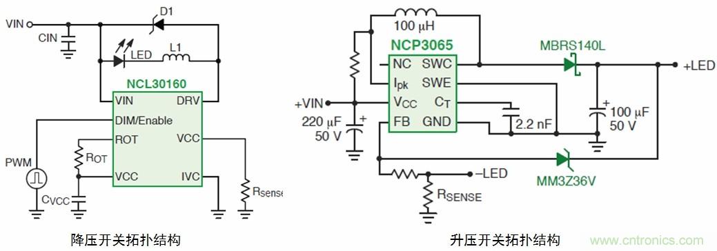 用于中等電壓通用照明的開關(guān)驅(qū)動(dòng)器有多種拓?fù)洌缃祲骸⑸龎海唤祲?升壓的NCP3065和NCP3066(可以配置為控制器)、NCP3163、MC33163、NCP1294;降壓的CAT4201、NCP1034、NCL30100、NCL30105、NCL30160、NCL30161;此外還有升壓或SEPIC的CS5171/3。