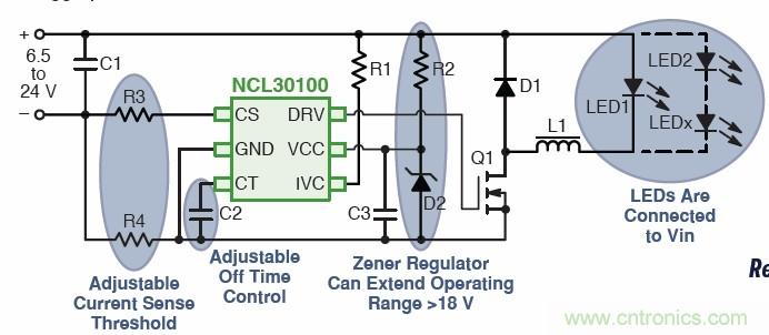 針對空間及高能效要求的低功率應(yīng)用,安森美半導(dǎo)體提供一款能效高達(dá)95%,又具有自然LED開路保護(hù)的固定關(guān)閉時(shí)間降壓LED驅(qū)動(dòng)器控制器NCL30100。該器件采用準(zhǔn)固定關(guān)閉時(shí)間、峰值電流遲滯控制方法,不要求補(bǔ)償元件;其低邊N-FET開關(guān)拓?fù)溥m合連續(xù)導(dǎo)電模式工作,無須輸出電容;其工作頻率小于500 kHz,±5%典型穩(wěn)流容限,VCC工作電壓范圍為6.35至18 V。