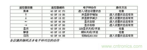 遙控器采用長虹彩電K11F型遙控器,遙控器按照16位地址碼,8位數據碼以及8位數據碼的反碼發送。表一列出了各按鍵的編碼及本電子鐘對應的動作。如果采用其他遙控器,需對程序相應部分的編碼作修改。