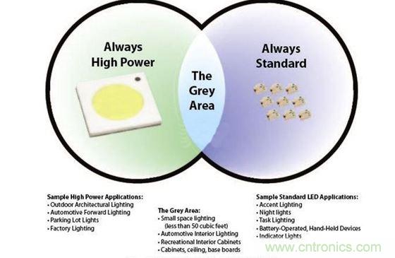 體積較小、通過電池供電或便攜式的設備(例如消費類電子產品、重點照明和標準指示燈等),已經在很長一段時間內使用了標準LED,而且有可能繼續使用。同樣,一些領域將會繼續使用大功率LED技術,包括:一般戶外照明、大面積的室內照明(軌道燈、燈泡替換物)以及汽車前照燈等。