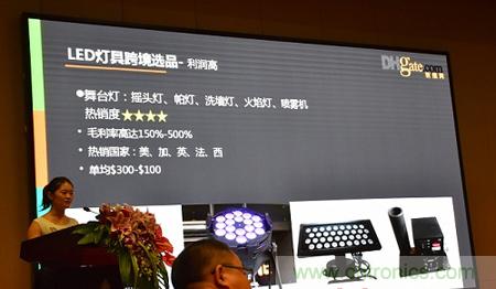 8月13日,由華強LED交易中心舉辦的“2015年首屆國際LED市場趨勢與跨境電商高峰論壇” 在華強酒店24樓會議大廳盛大舉行,現場200多人大廳人頭濟濟,來自敦煌網業務運營部的行業經理周慧榮做了主題為《LED燈具的外貿B2B商機》的演講,她從敦煌網2012年到2015年LED燈具發展現狀入手,揭示了海外買家對中國LED燈具需求趨勢和熱點分析。