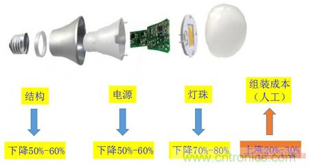 從上圖表示,LED光源產(chǎn)品無(wú)論是從結(jié)構(gòu),電源還是燈珠,成本都有大幅下降至少50%,然而人工組裝成本卻漲幅近20%-30%。晶豐明源銷(xiāo)售總監(jiān)李寧在第六屆華強(qiáng)國(guó)際LED照明市場(chǎng)戰(zhàn)略暨創(chuàng)新技術(shù)研討會(huì)上表示:“晶豐明源將持續(xù)提供更高性價(jià)比的整體電源方案來(lái)提高客戶的競(jìng)爭(zhēng)力,其次,實(shí)現(xiàn)全自動(dòng)化生產(chǎn),提高效率,從而幫助客戶降低人工成本。”