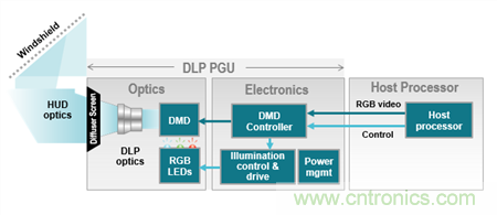 利用DLP®技術獨特的中間散射屏結構,可以設計出能夠承受由太陽光放大所產生熱負荷的HUD。如圖3所示,基于DLP技術的HUD可以將圖像投射到散射屏上,然后HUD光學器件將其放大并投射到擋風玻璃上,從而呈現在駕駛員的視線中。在TFT HUD中,TFT面板連接到HUD光學器件,取代了散射屏和輔助電子器件。