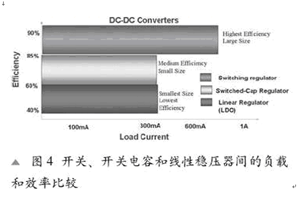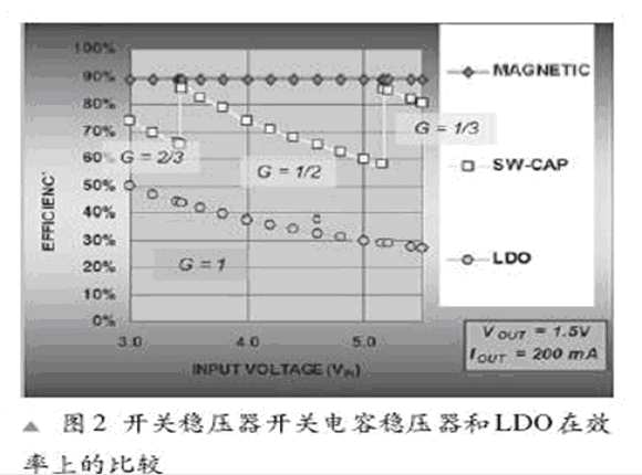 隨著VIN的增長,由轉(zhuǎn)換器產(chǎn)生的VIN和VOUT 間的增量增長引起功率消耗的增長和效率的下降。解決這個問題的一個方式是轉(zhuǎn)變成一個更高的效率增益,就像給汽車替換齒輪一樣。圖2顯示了一個開關(guān)電容器降壓穩(wěn)壓器,一個LDO及一個開關(guān)電容器的效率曲線。開關(guān)電容器具有一個模擬增益控制和增益變化以保持一個給定負載效率的持續(xù)性。開關(guān)電容器并具有離散增益步驟,由VOUT/(增益 *VIN)與離散增益來決定效率的高低。一個LDO僅有1的增益及三者中最低的效率。開關(guān)電容器(SC)穩(wěn)壓器則有三個不同的電壓增益(2/3,1/2和1/3)。我們可以看到,開關(guān)電容穩(wěn)壓器隨著VIN 的增長,電壓增益從2/3轉(zhuǎn)到1/2以及從1/2到1/3,因此整個負載范圍的效率達到最大化。這就帶來了在Li-ion 范圍上(3.4V到3.8V)80%的效率。在相同應(yīng)用中的一個LDO僅能達到50%的效率。根據(jù)電感器種類,一個典型的開關(guān)穩(wěn)壓器大約具有88-90%的效率。