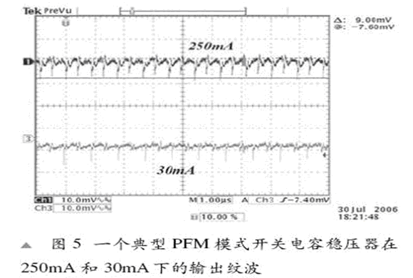 在PFM類系統(tǒng)中,可以感應(yīng)到輸出電壓,當這個電壓高于一個指定值時,穩(wěn)壓器就會關(guān)閉,等到輸出電壓降到所需值以下時再重新開啟。使用PFM控制模式的缺點是工作頻率取于VIN 和 ILOAD ,因此變化不定。負載越高、工作頻率就越接近指定頻率。這個操作范圍上的頻率變化在一些便攜式應(yīng)用中可能不大合適。輸入電壓紋波也取決于VIN 和 ILOAD。圖5顯示了250mA 和 30mA 負載的輸出紋波。10mF COUT 的輸出紋波將為50mV,我們可以看到250mA負載的紋波頻率高于10mA負載的紋波頻率。