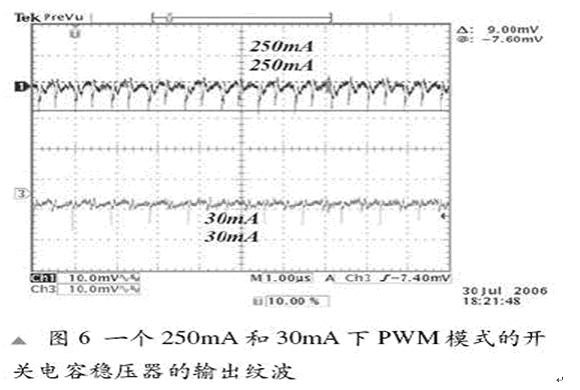 比較新的PWM調(diào)控模式處理了PFM架構(gòu)中的各種頻率和高輸出紋波。大多數(shù)的新型開關(guān)電容穩(wěn)壓器都采用PWM調(diào)制模式。在這種模式下,功率FET的電阻根據(jù)VOUT 和 ILOAD進行控制。這樣做,我們就真正控制了快速電容器(CFLY)所提供的充電量。這也被稱為預(yù)調(diào)制。在這種模式下,操作頻率和工作周期都是固定的。一個PWM架構(gòu)的例子是LM2771,圖6顯示出它的輸出紋波。它處于一個帶有4.7mF COUT 的8mV -10mV的順序中。我們可以看到在ILOAD變化的情況下紋波可以持續(xù)。一個9mV的紋波輸出可以與在感應(yīng)開關(guān)穩(wěn)壓器中的紋波相媲美。