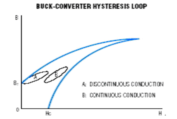 磁芯損耗主要是由于磁滯現象以及磁芯內部傳導率或其他非線性參數的互感產生。在Buck拓撲結構中,第一象限的B-H磁滯回線對磁芯損耗影響最大。在第一象限這個局部圖中,磁滯回線顯示了電感從初始電感量過渡到峰值電感量再回到初始電感量的過程。如果開關電源穩定工作在不連續狀態,磁滯回線會從剩余電感量(Br)過渡到峰值電感量(參考圖1)。如果開關電源工作在連續狀態,那么磁滯回線將會從直流偏置點上升到曲線峰值,再回到直流偏置點。通過實驗可以確定磁滯回線的精確曲線形狀(基本上是橢圓曲線)。