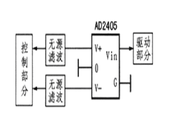 控制電路為弱電部分,極易受到干擾;驅動電路直接與外電路連接,是一個較強的干擾源;為了實現(xiàn)整個設備的電磁兼容,控制電路部分必須與驅動部分隔離。為了避免公共電源對控制電路產(chǎn)生干擾,應對控制電路及驅動電路分別供電,EXB84l的電源電壓為+20 V,一般控制電路的供電電壓為5 V,因此,可以利用圖4所示的DC-DC微功率模塊進行電源隔離,采A2405D型微功率模塊實現(xiàn)電源的隔離。