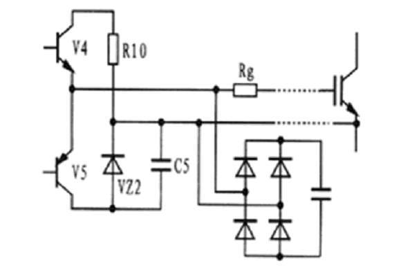 圖5所示為EXB841與IGBT柵-射極之間的連接電路原理圖。當驅動電路中的V4導通時,IGBT處于正常導通狀態(tài),當V5導通時,IGBT柵-射極之間通過穩(wěn)壓管VZ2提供一個-5V電壓加在其兩端,使IGBT關斷,此時V5處于臨界導通狀態(tài),穩(wěn)壓管VZ2處于反向偏置狀態(tài)。但由于集-柵極之間分布電容的影響,集-柵極之間的du/dt增大時,其通過分布電容形成的電流經(jīng)過,所以,要克服集-柵極之間的du/dt,確保穩(wěn)壓管不過壓,避免IGBT誤導通。克服du/dt的方法有二種:一是驅動電路輸出與IGBT柵-射極之間的連線采用雙絞屏蔽電纜,屏蔽層接地,二是采用快速吸收電路吸收過電壓。