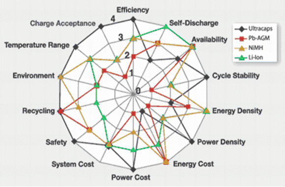 Li離子、NiMH等新型電池可以提供一個可靠的能量儲存方案,并且已經在很多領域中廣泛使用。眾所周知,化學電池是通過電化學反應,產生法拉第電荷轉移來儲存電荷的,使用壽命較短,并且受溫度影響較大,這也同樣是采用鉛酸電池(蓄電池)的設計者所面臨的困難。同時,大電流會直接影響這些電池的壽命,因此,對于要求長壽命、高可靠性的某些應用,這些基于化學反應的電池就顯出種種不足。