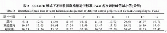 從表中給出的以標準周期PWM前19次諧波為參照的數據可以看出,分別在混沌、亞超混沌及超混沌信號調制下,各次諧波對應處的頻譜數值都得到了明顯的降低。在混沌信號調制下,諧波對應處的頻譜數值平均降低14.87分貝(dB);在亞超混沌信號調制下,諧波對應處的頻譜數值平均降低16.84分貝(dB);在超混沌信號調制下,諧波對應處的頻譜數值平均降低17.86分貝(dB)。若以歐盟(89/336/EEC指令)電磁兼容性導則中限制設備輸入電流諧波分量最大值幅度這一原則,來討論不同性質混沌信號降低電磁干擾水平的效果,結論非常明顯,即以超混沌信號作為開關調制信號源,比混沌能更好地降低電磁干擾水平。