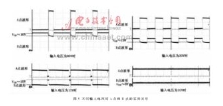 圖5為當(dāng)輸出電壓為10V、電流為2A時,在不同輸入電壓狀態(tài)下,圖3中A點(diǎn)和B點(diǎn)的實(shí)測波形。由圖5可知,當(dāng)輸入電壓為13V時,MOSFET關(guān)斷時間很短,當(dāng)輸入電壓為10V時,MOSFET則一直導(dǎo)通。