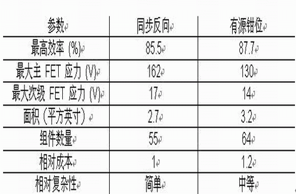 表 2 列出了對兩種同步反向電源主要部分進行比較的總結。該表說明了有源鉗位反向電源相對于變壓器驅動同步反向電源在性能上的優勢。尤其是在輕負載情況下,有源鉗位反向電源具有更低的 FET 電壓應力及更高的效率。有源鉗位控制器 (UCC2897) 的可編程停滯時間特性(該特性可防止主、次級 FET 的疊加傳導 (overlapping conduction))有助于最小化 Q1 二次側直通損耗。這些損耗一般表現為可在主電流感應電阻器上觀測到的一個大電流峰值,且經常會導致輕負載抖動的問題。有源鉗位反向電源較低的高頻振鈴會產生更少的 EMI 及一個全局范圍內更低噪聲的電源。由于漏極電感對有源鉗位電路性能的影響較小,因此,盡管同步反向電源并不是一無是處,但比起帶有同步反向的情況,高頻操作更有可能實現。在這兩個示例電路中,與有源鉗位反向電源相比,傳統的同步反向電源可將 PWB 面積、組件數量和成本上降低大約 15%~20%。這是一款容易設計和(可論證性地)理解的更簡單的電路,雖然如此,但還是要考慮到其在性能上的一些不足。那么,您應該在什么時候選擇一個有源鉗位反向電源呢?如果輸出功率較低,同時設計要求一直進行連續模式運行,那么有源鉗位反向電源可以實現高效率、低 EMI 運行。在輕負載效率較為關鍵的應用中,它具有一個更為明顯的優勢。
