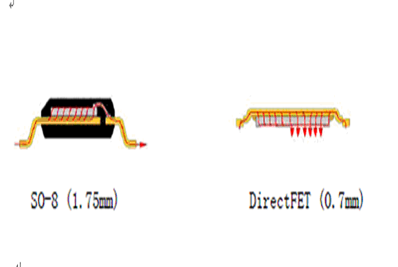傳統(tǒng)的MOSFET使用引線鍵合來實現(xiàn)硅片和管腳框架之間的電連接,而DirectFET,將接觸面的數(shù)目和傳導(dǎo)路徑的長度減到最小從而減小了傳導(dǎo)損耗。