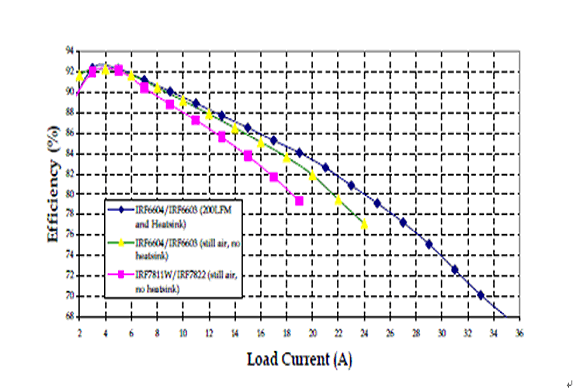 在一個12V輸入,1.3V輸出,工作頻率300kHZ的同步降壓變換器中,我們將IRF6603/IRF6604和IRF7822/IRF7811W這兩對管子做以比較,它們使用的硅片技術(shù)是相同的。負載電流增加時,此變換器電路板的溫度不得超過105°C。當(dāng)電流達到18A時,這是SO8封裝在無冷卻氣流的條件下能夠承受的大電流,IRF6603的結(jié)溫要低50°C。比較DirectFET和SO-8在靜止空氣無散熱器條件下的效率曲線,在18A時前者的效率要高出3%。