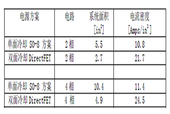 為了計算方便,假設(shè)單面冷卻的器件被限制在0.5 in2 的PCB板內(nèi),我們知道設(shè)計者往往用到1in2 以盡可能增加SO8的輸出電流。DirectFET器件布置在最小的管腳尺寸內(nèi)。下表給出了論證結(jié)果,表明在大電流DC-DC變換器中,雙面散熱的DirectFET的電流密度能比單面散熱的SO8的增加一倍。