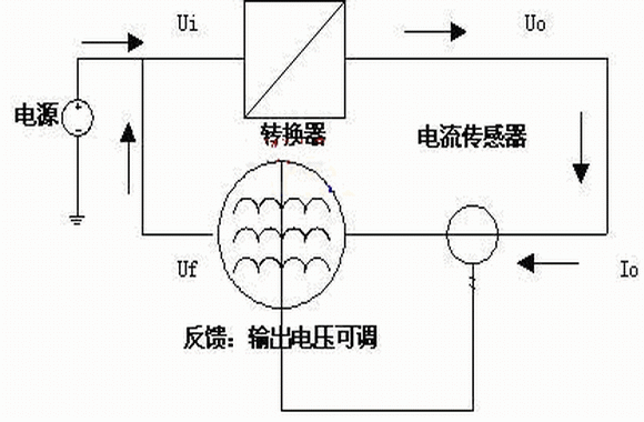在能量反饋部分就要能實(shí)現(xiàn)上述要求,保證穩(wěn)定的電能轉(zhuǎn)換器的輸出電流,采用電流傳感器檢測電能轉(zhuǎn)換器的輸出電流,同時(shí)反饋部分采用反饋電壓與輸出控制電流之間成反比系數(shù)關(guān)系即Uf∝K/Io,為便于分析,設(shè)電源電壓Ui為穩(wěn)定值。當(dāng)輸出電流較小時(shí),通過調(diào)節(jié)反饋電壓,使其變大,則反饋電壓與輸入的電壓差△U=Uf-Ui變大, 相應(yīng)的由反饋電壓流向輸入電壓的電流加大,造成相應(yīng)的反饋功率加大;當(dāng)輸出電流較大時(shí),通過調(diào)節(jié)反饋電壓,使Uf變小,則反饋電壓與輸入的電壓差△U變小,相應(yīng)的由反饋電壓流向輸入電壓的電流減小,造成循環(huán)的功率減小;整個(gè)過程維持負(fù)反饋控制,最終達(dá)到動(dòng)態(tài)平衡,維持設(shè)定的額定功率。