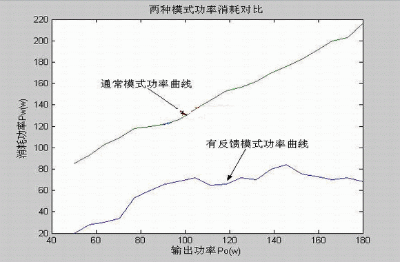 結(jié)果分析:在通常工作模式情況下,曲線的波動(dòng)是由于電能轉(zhuǎn)換器的轉(zhuǎn)換效率影響造成的,由前面原理分析可知消耗功率為Pi=Po+Pw, 如果轉(zhuǎn)換效率為 ,則Pi=Po/η,轉(zhuǎn)換效率η通常隨著輸出功率的變化有一定的波動(dòng),所以曲線的波動(dòng)符合理論分析;在有反饋的工作模式情況下,由前面原理分析部分得系統(tǒng)的消耗功率為Pi=Pw+Pwf,分別設(shè)轉(zhuǎn)換器1的轉(zhuǎn)換效率為η1,反饋部分的轉(zhuǎn)換效率為η2,則系統(tǒng)的消耗功率為:
