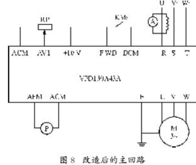 由于這是對舊設備進行改造,所以在改造中充分考慮并照顧操作人員的操作習慣,保持原有的工作順序不變。根據(jù)操作人員的實際需要,重新設計了主回路及控制回路。用電位器給定頻率,控制電動機的轉速,實現(xiàn)無級調(diào)速。用一轉速表顯示電動機的實際轉速,給操作人員提供可靠的操作依據(jù)。