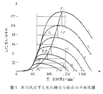 風力機通過葉輪來捕獲流動的風能,風的能量轉化為葉輪旋轉的動能,齒輪箱再把這種機械能傳輸到發電機,由發電機通過內部的電磁關系將機械能變為電能輸出。圖5為在不同風速下,葉輪轉速與風力機輸出功率的關系圖。由圖可知,對應于每個風速的曲線,都有一個最大輸出功率點,風速越高,輸出功率越高,相應的葉輪轉速也越高。因此,如果能隨風速變化改變葉輪轉速,使得風力機在所有風速下都工作于最大功率輸出點,則發出電能最多,否則發電效能將降低。