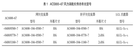如前所述,雙饋風力發電系統的變頻器由于接在發電機的轉子側,所以變頻器容量可小于發電機的容量,僅為發電機的轉差功率,因此,變頻器容量的選擇與風力發電機的調速范圍密切相關。一般風力發電機的調速范圍為額定轉速的70%~130%,轉差率為±30%,所以變頻器的額定容量可選為發電機額定容量的1/3。表1為ACS800-67的選型表。