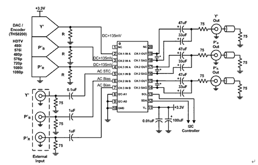 AC偏置非常簡單。THS73x3有兩個電阻,其可在電源和接地間創建分壓器。該模式的輸入阻抗為20kΩ,因此所用的電容應足夠大,以盡可能減小傾斜或下垂問題。該模式最適用于Chroma或色差信號,也可用于Luma信號、G’B’R’信號或計算機的R’G’B’信號。由于信號為AC耦合,且DC偏置點與平均信號電平有差異,因此對于帶5V電源同步信息的信號而言,我們最好用AC偏置模式,以確保沒有剪切問題發生。