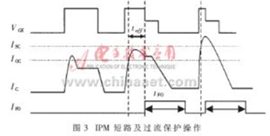(3)過流保護(OC):若流過IGBT的電流值超過過流動作電流,且時間超過toff,則發生過流保護,封鎖門極驅動電路,輸出故障信號。為避免發生過大的,大多數IPM采用兩級關斷模式,過流保護和短路保護操作可參見圖3。其中,VG為內部門極驅動電壓,ISC為短路電流值,IOC為過流電流值,IC為集電極電流,IFO為故障輸出電流。