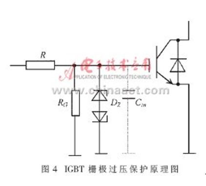 IGBT的驅動設計問題亦即MOSFET的驅動設計問題;設計時應注意以下幾點:①IGBT柵極耐壓一般在±20V左右,因此驅動電路輸出端要給柵極加電壓保護,通常的做法是在柵極并聯穩壓二極管或者電阻。前者的缺陷是將增加等效輸入電容Cin,從而影響開關速度,后者的缺陷是將減小輸入阻抗,增大驅動電流,使用時應根據需要取舍。圖4為IGBT柵極保護原理圖,其中,RG、DZ、Cin分別為等效柵極阻抗、穩壓管和等效輸入電容。②盡管IGBT所需驅動功率很小,但由于MOSFET存在輸入電容Cin,開關過程中需要對電容充放電,因此驅動電路的輸出電流應足夠大,這一點設計者往往忽略。假定開通驅動時,在上升時間tr內線性地對MOSFET輸入電容Cin充電,則驅動電流為,其中可取tr=2.2RCin,R為輸入回路電阻。③為可靠關閉IGBT; 防止擎住現象; 要給柵極加一負偏壓,因此最好采用雙電源供電。