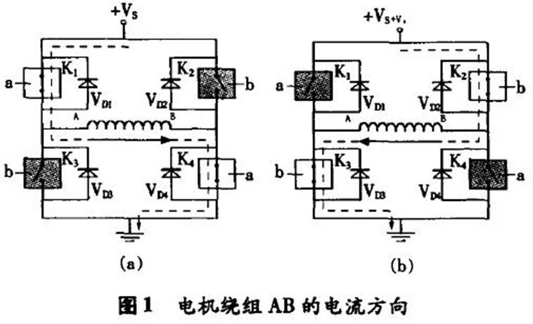 4個(gè)開關(guān)K1和K4,K2和K3分別受控制信號a,b的控制,當(dāng)控制信號使開關(guān)K1,K4合上,K2,K3斷開時(shí),電流在線圈中的流向如圖1(a),當(dāng)控制信號使開關(guān)K2,K3合上,K1,K4斷開時(shí),電流在線圈中的流向如圖1(b)所示。4個(gè)二極管VD1,VD2,VD3,VD4為續(xù)流二極管,它們所起的作用是:以圖1(a)為例,當(dāng)K1,K4開關(guān)受控制由閉合轉(zhuǎn)向斷開時(shí),由于此時(shí)線圈繞組AB上的電流不能突變,仍需按原電流方向流動(即A→B),此時(shí)由VD3,VD2來提供回路。因此,電流在K1,K4關(guān)斷的瞬間由地→VD3→線圈繞組AB→VD2→電源+Vs形成續(xù)流回路。同理,在圖1(b)中,當(dāng)開關(guān)K2,K3關(guān)斷的瞬間,由二極管VD4,VD1提供線圈繞組的續(xù)流,電流回路為地→VD4→線圈繞組BA→VD1→電源+Vs。步進(jìn)電機(jī)驅(qū)動器中,實(shí)現(xiàn)上述開關(guān)功能的